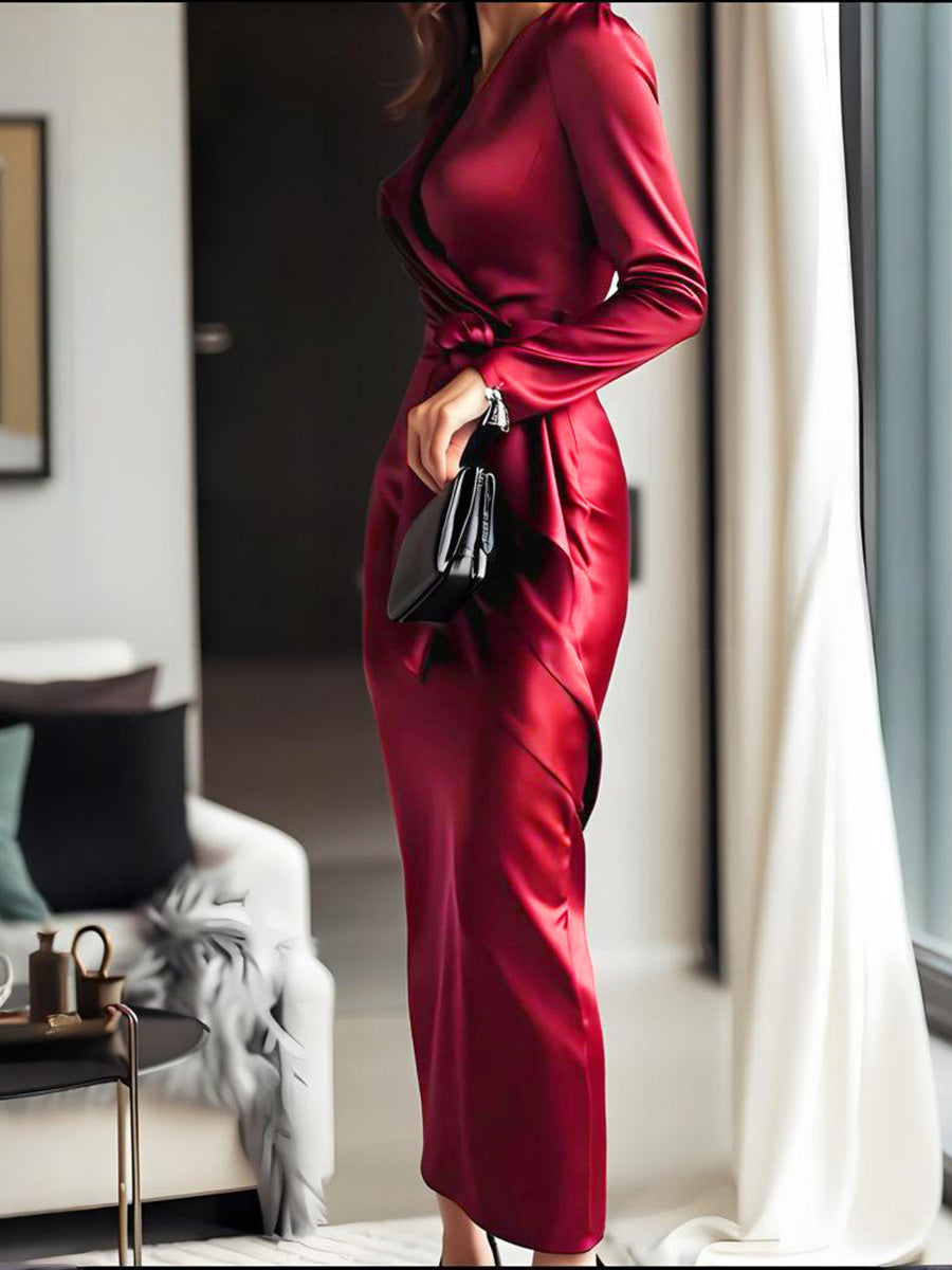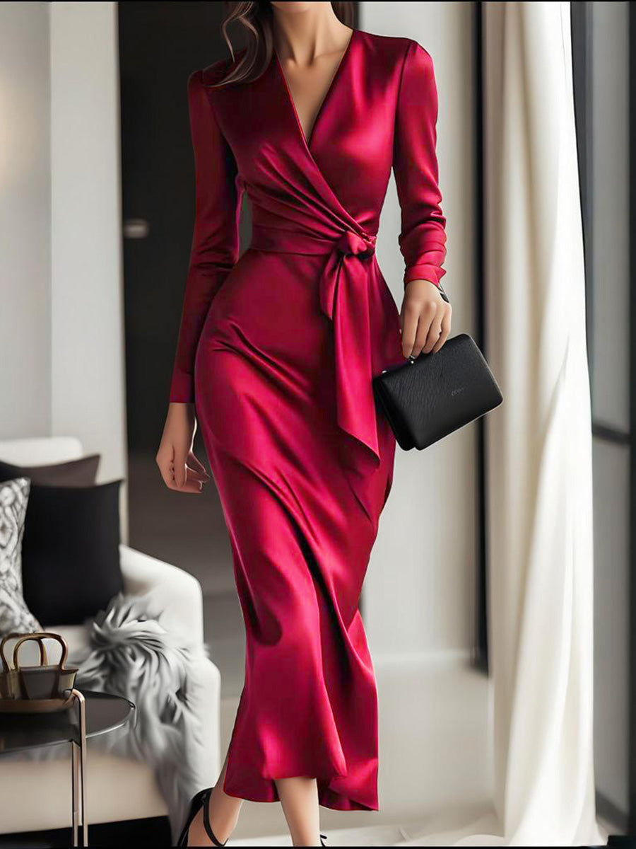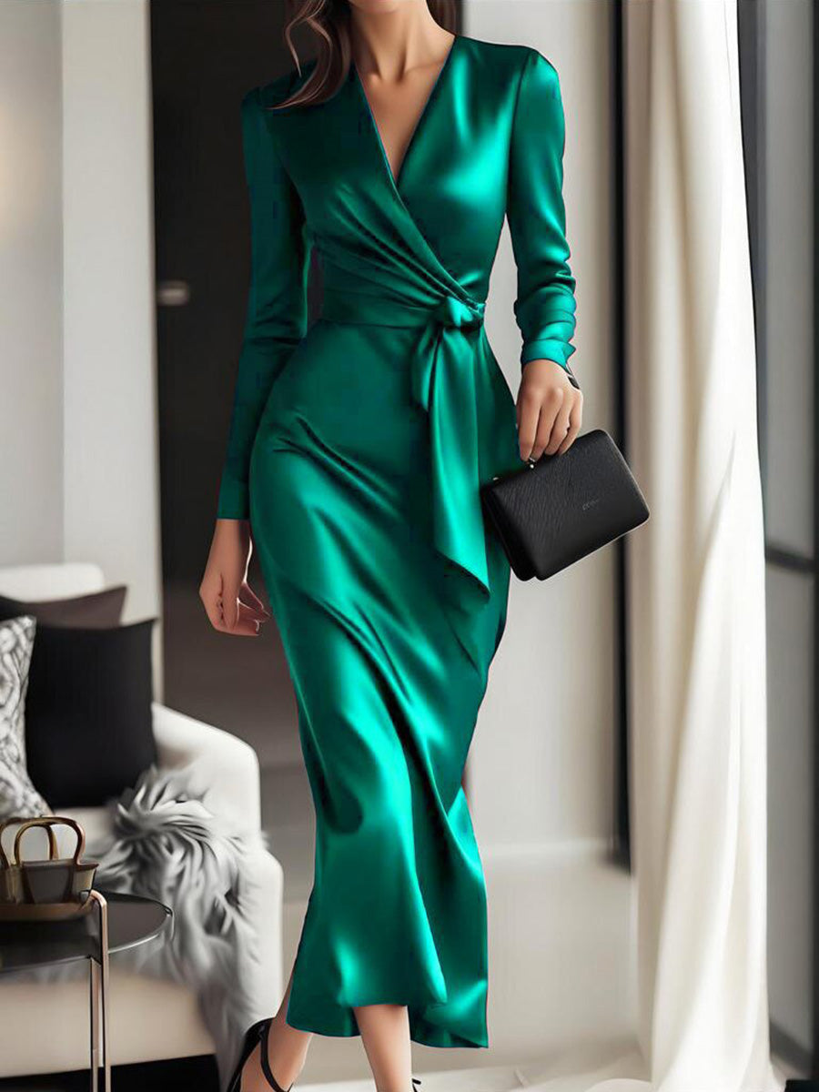 Elevate your evening with this sophisticated long dress, designed to flatter and captivate. The fitted silhouette hugs your curves while the high-waisted cut elongates your frame for a refined, polished look. A graceful V-neckline draws the eye upward, while the tie-waist detail adds an elegant touch of definition and movement. Perfect for cocktail events, dinners, or any occasion where you want to make a memorable impression. Crafted for the modern woman who values both style and confidence.
