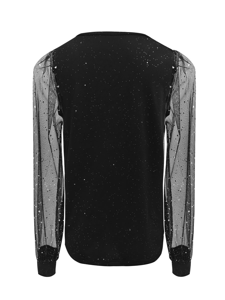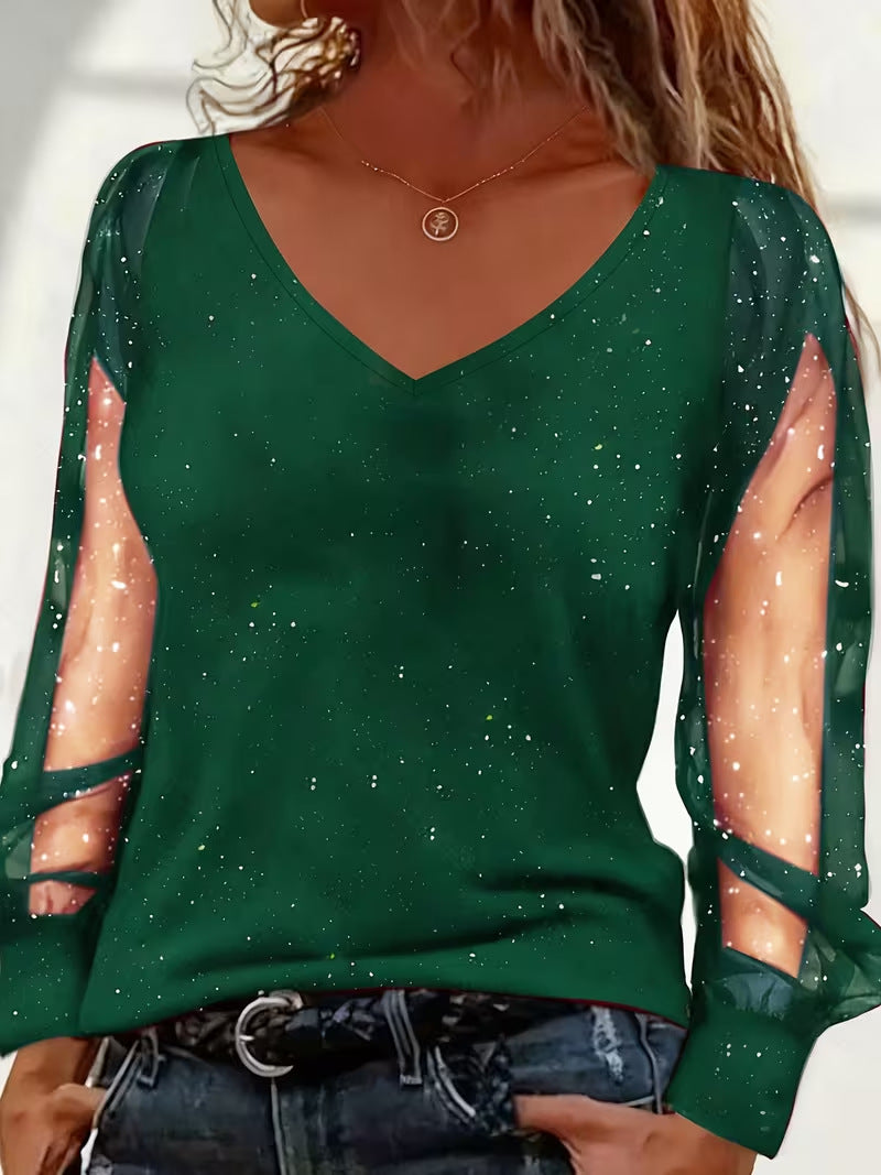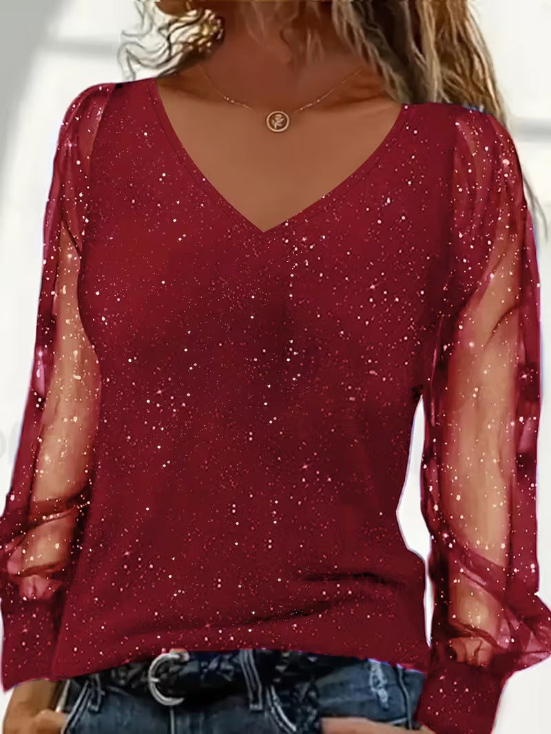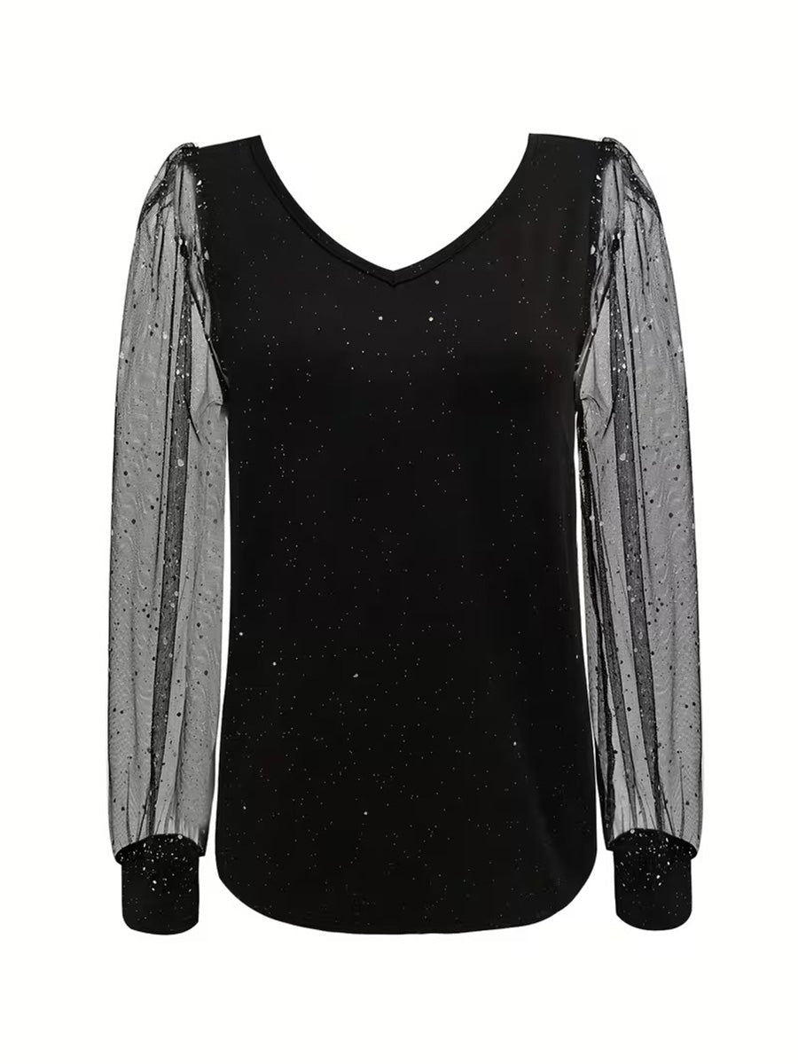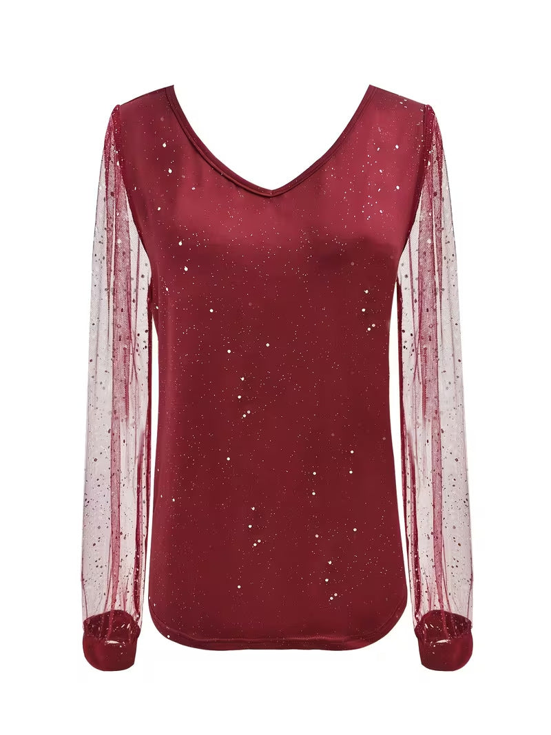 Elevate your everyday wardrobe with this sophisticated patchwork mesh long-sleeve top. The refined V-neckline flatters while the mixed-fabric construction—combining breathable mesh with structured panels—creates visual interest and dimension. Perfect for layering or wearing solo, this piece transitions seamlessly from casual daytime looks to polished evening occasions. The elegant silhouette and thoughtful design details make it an essential addition to any premium fashion collection.