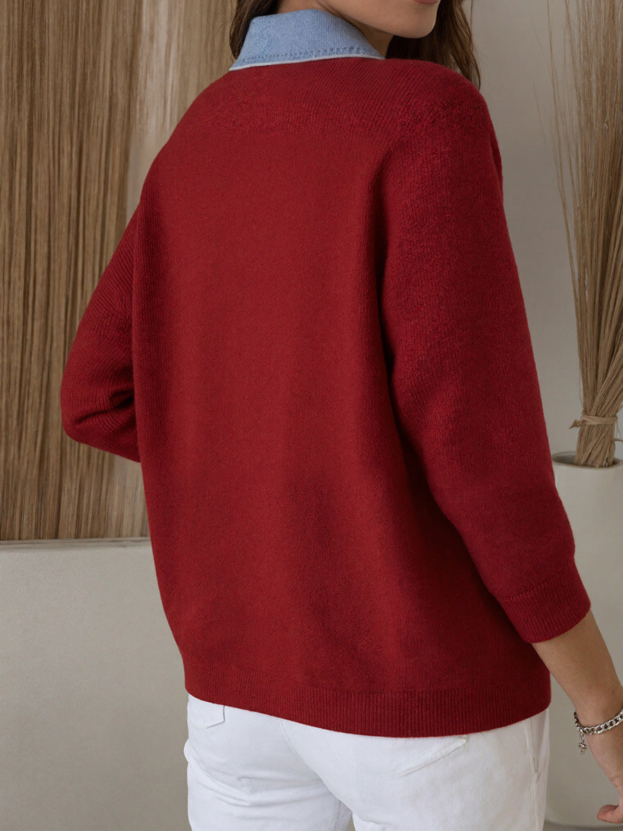 Honestly didn’t expect to love this as much as I do, but it’s become one of my most-worn layers. The denim patches give it personality without being too bold, and the knit is surprisingly smooth against the skin. I wore it during a long workday and it stayed comfortable the entire time — no stretching at the elbows and no sagging at the pockets. What impressed me most is how versatile it is: works with jeans, wide-leg pants, and even over simple dresses. After washing, the shape stayed intact and the denim pieces didn’t stiffen up like I feared they might. Packaging arrived clean with no odd smells. Overall this piece feels thoughtful and well made, definitely worth the price.