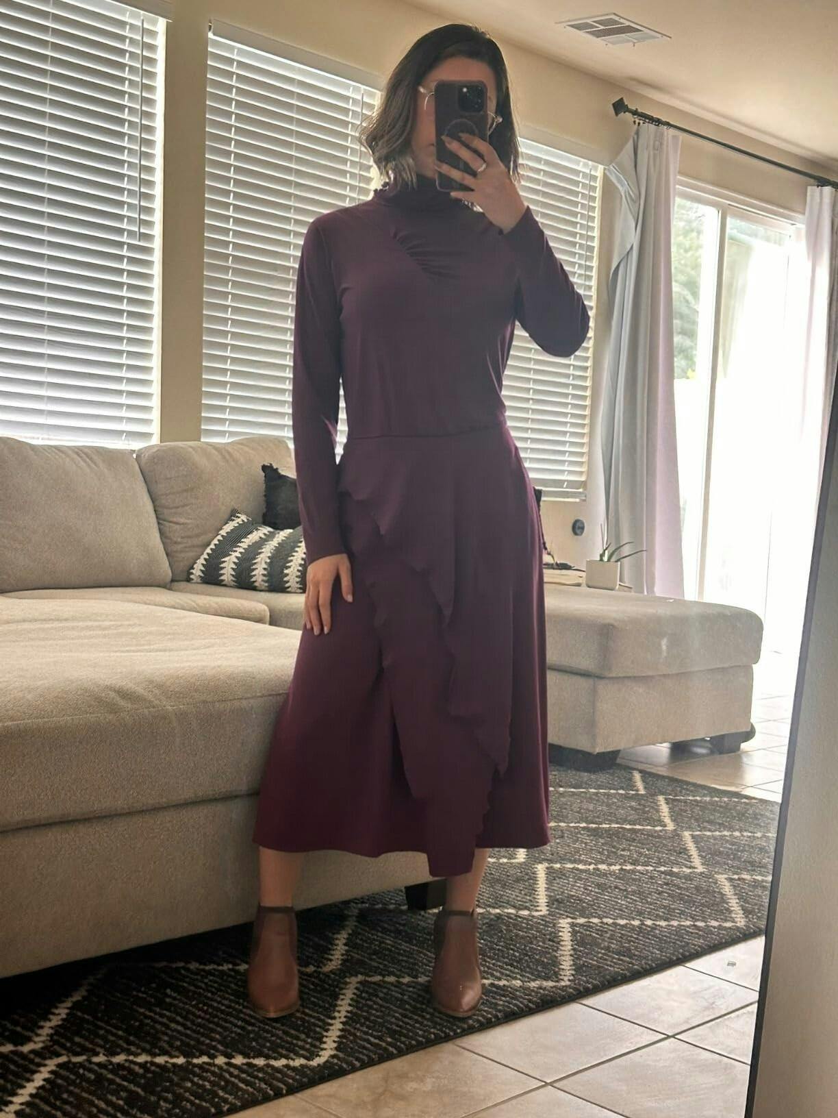The asymmetric high neck design feels stylish and the fabric has a soft weight. I wore it for an evening dinner and felt comfortable and elegant.