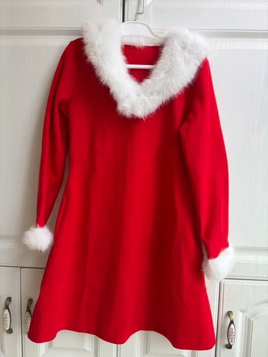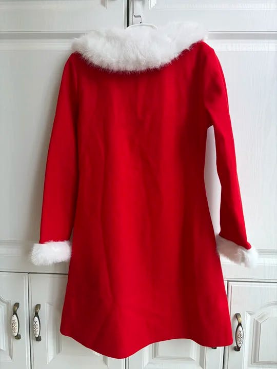 Short one: love it! 5′8″, 160 lbs, size L. The fit is flattering, fabric feels good quality, and the fur collar is surprisingly soft. Wore it once and got multiple compliments. Easy festive outfit — highly recommend if you want something simple but chic.