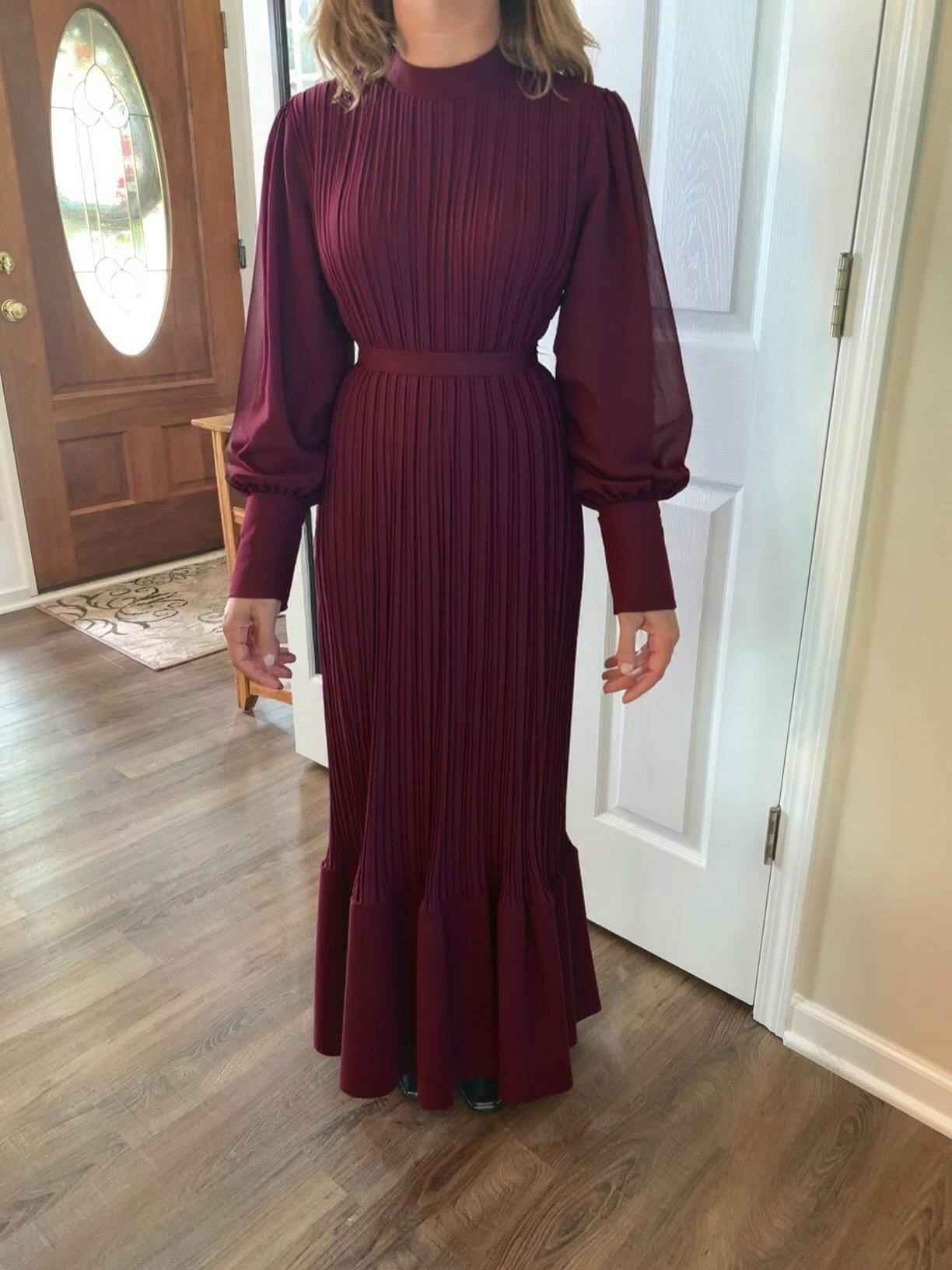 Make a statement with this sophisticated long-sleeved pleated dress, designed for those who appreciate refined elegance. The structured pleats create beautiful movement and dimension, while full-length sleeves provide graceful coverage and versatility across seasons. This dress effortlessly transitions from professional settings to evening occasions, offering a polished appearance that commands attention. The thoughtful construction ensures a flattering fit that celebrates your silhouette while maintaining understated luxury. Perfect for anyone seeking a timeless piece that combines style, comfort, and undeniable sophistication for any memorable occasion.