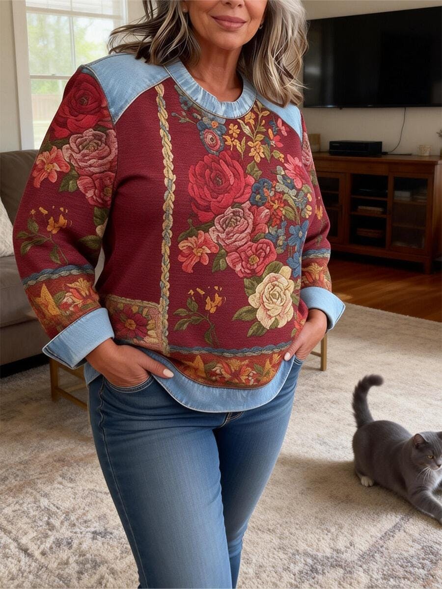 - Vintage Print Denim Patchwork Long Sleeve Sweatshirt